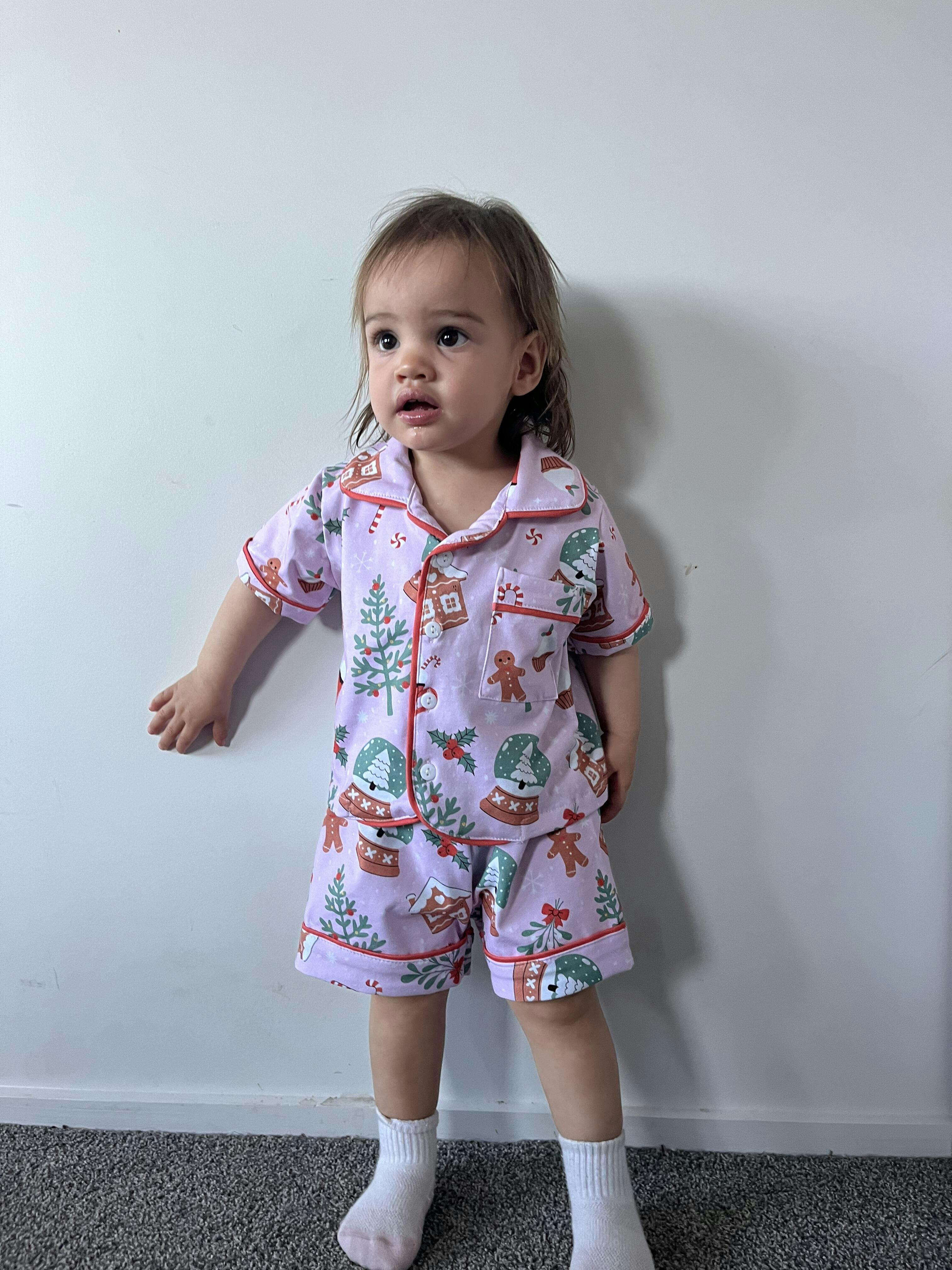 Made from a comfy blend of 95% cotton and 5% elastane, they’re breathable, stretchy, and gentle on sensitive skin—perfect for warm summer nights and Christmas mornings alike. The button-up shirt and matching shorts create a classic, relaxed fit that lets your child sleep, play, and lounge in total comfort.