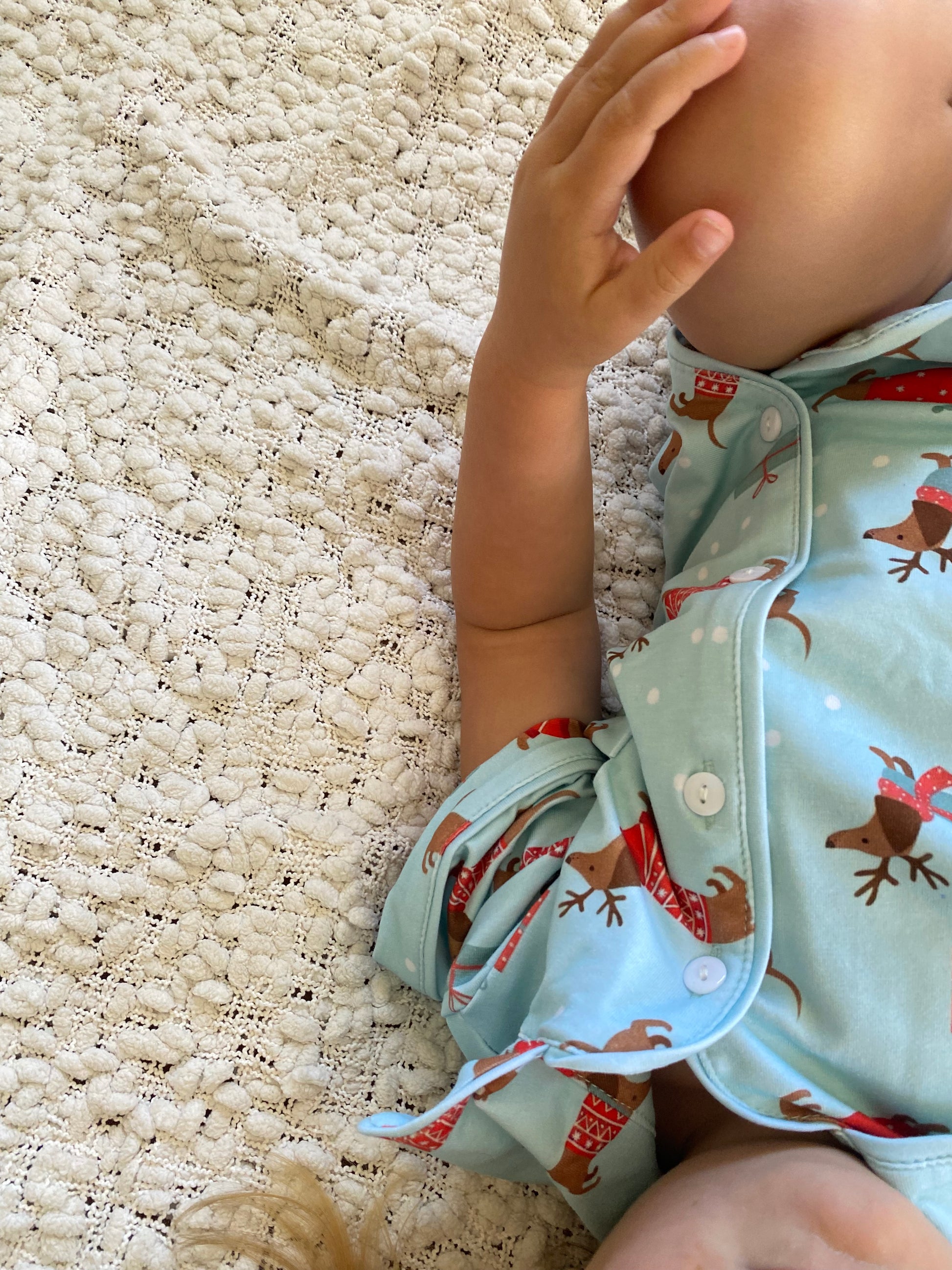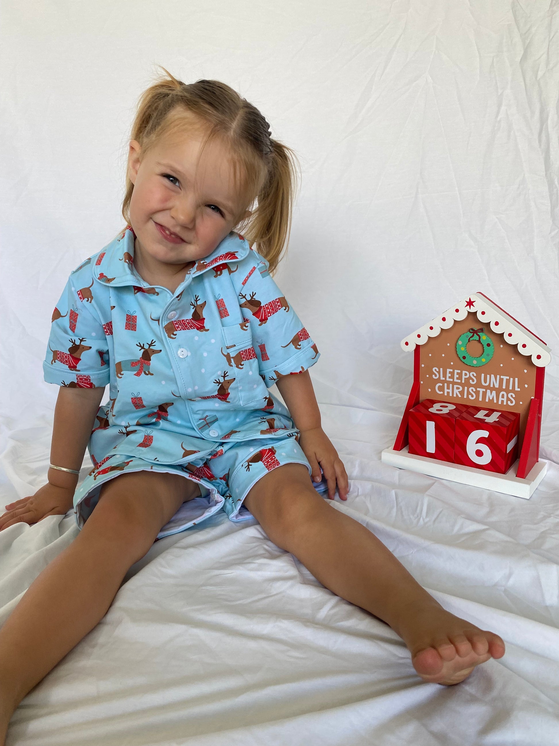 Get your little one ready for the festive countdown with our Dachshund Through the Snow Pyjama Set! Featuring an adorable sausage-dog Christmas print on a soft sky-blue background, these short-sleeve PJs bring all the fun and magic of the season.