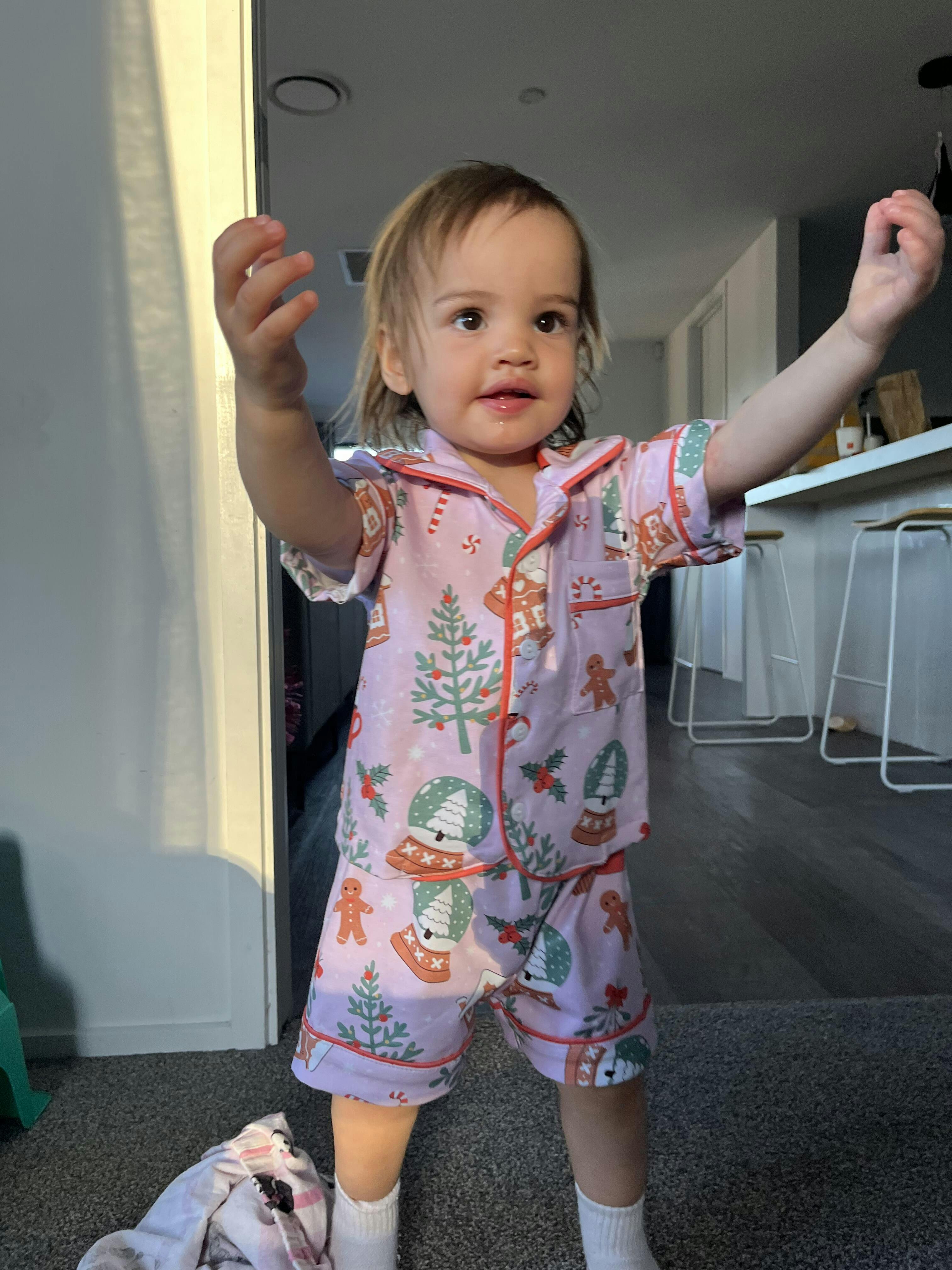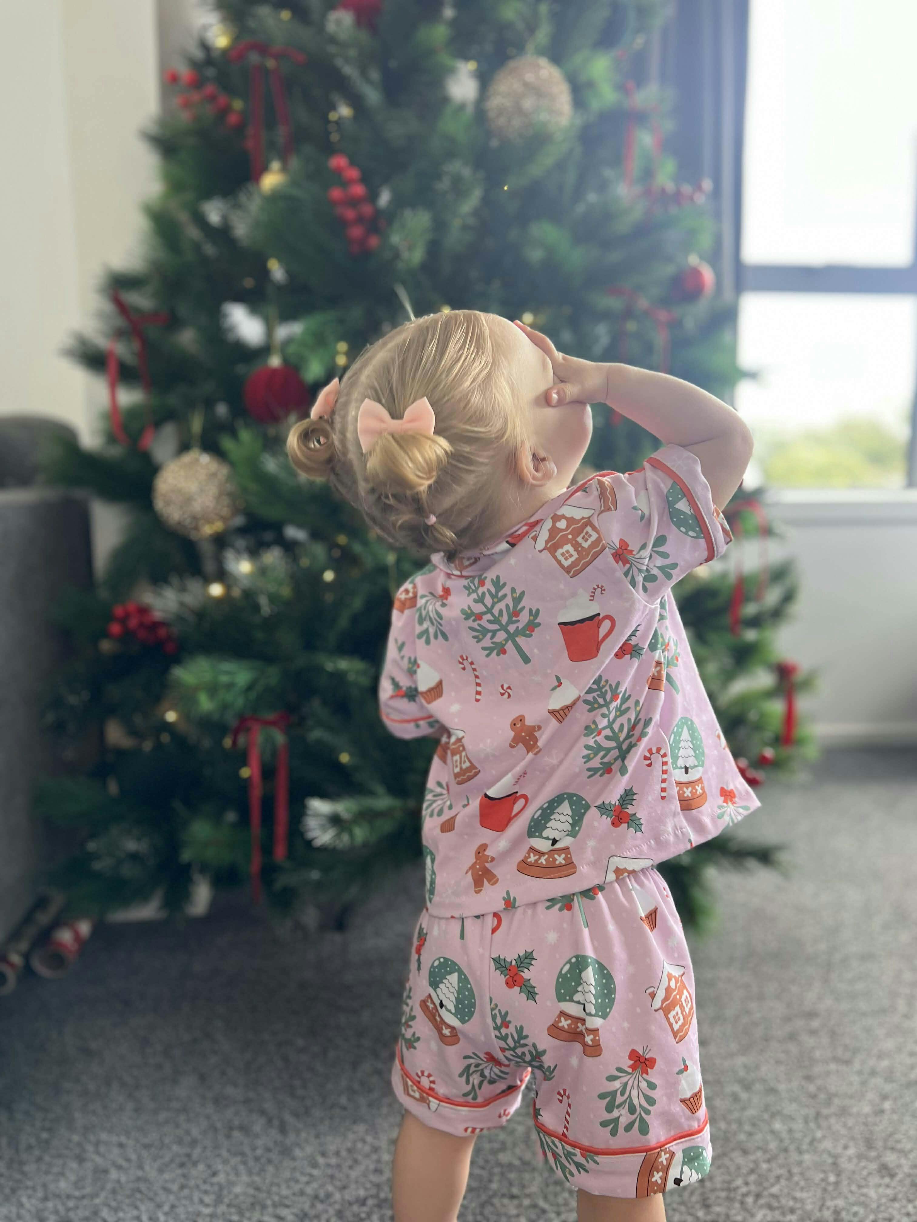 Featuring a sweet pink base covered in gingerbread men, candy canes, snow globes Christmas trees, holly, and cosy hot chocolate mugs, these pyjamas bring all the holiday magic in one playful print. The button-up top and matching shorts create a lightweight, breezy fit—ideal for warm summer nights or Christmas celebrations in warmer weather.